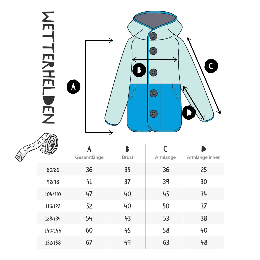 👉 Besonderheit: Durch das Einklicken einer Kuscheljacke wirkt die Wetterhelden Jacke oft eine Nummer kleiner. Vorteil: Wählst du sie etwas größer, passt sie ohne Innenjacke auch im nächsten Jahr noch perfekt.